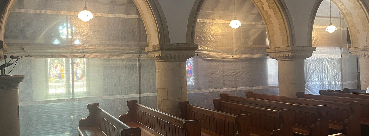 Perimeter-independent scaffolding and access towers for remedial works at a church.